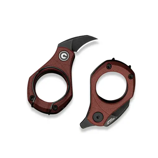 6,7 cm lång fällkniv med fidgetvänlig fällkniv med ett hawkbillformat knivblad av 14C28N med en hårdhet på HRC 58-60. Knivskaftet är tillverkat av Burgundyröd G10 med svarta liners och svart backspacer. Denna fällkniv är försedd med kullager vilket gör att den är mjuk, lätt, smidig och snabb att öppna.