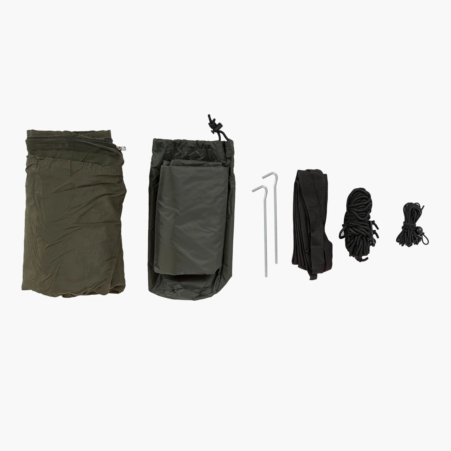 Paketet innehåller starka spännband, två karbiner, stormlinor och hållbara tältpinnar.