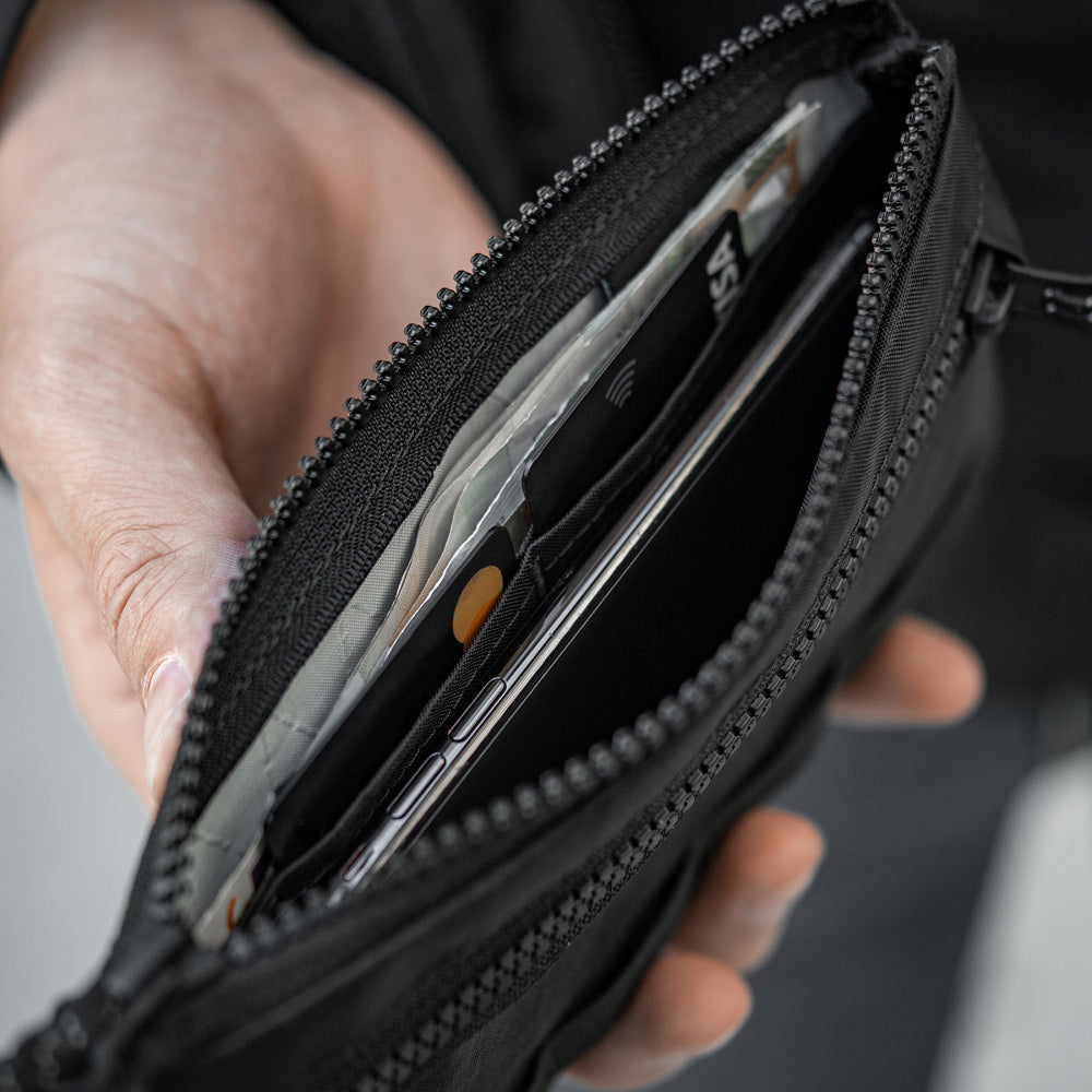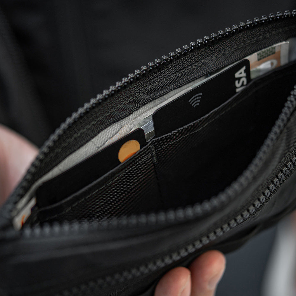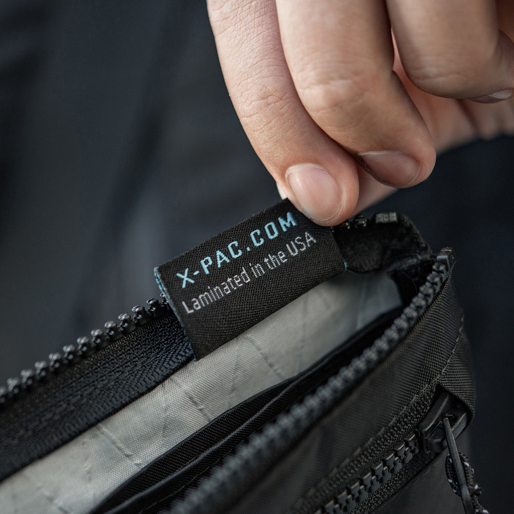 En slitstark och lätt plånbok tillverkad i det innovativa X-PAC-materialet – känt för sin höga hållbarhet och motståndskraft mot vatten och UV-strålning.
