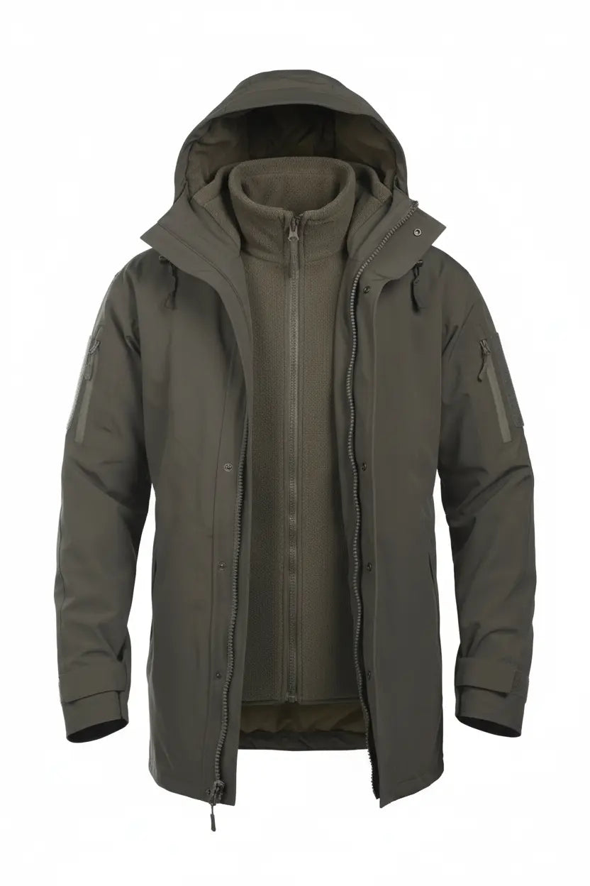 Mil-Tec Skaljacka + Fleecejacka är en vatten- och vindtät trelagers regnjacka med avtagbart fleecefoder. Yttertyget är gjort av polyester och elastan med ett membran som ger cirka 5000 mm vattenpelare och god andningsförmåga. Fleecejackan inuti kan användas separat eller tillsammans med ytterjackan, vilket gör plagget anpassningsbart för olika väder.