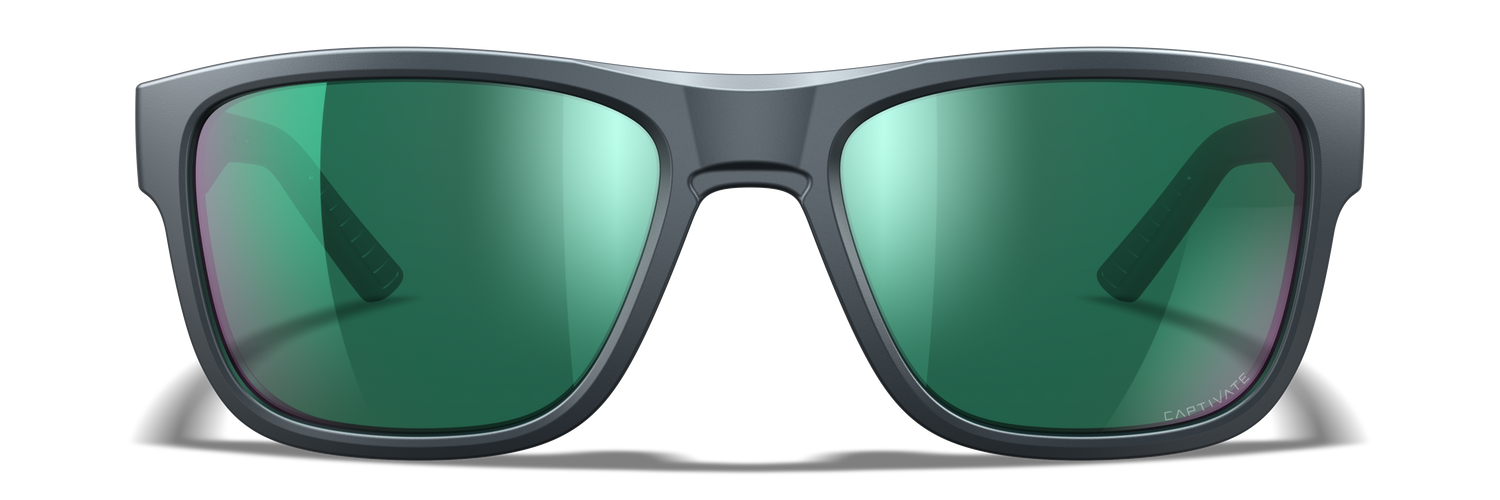 Wiley X Ovation är en slitstark och stilren skydds- och solglasögonmodell i Matte Graphite med CAPTIVATE™ Polarized Green Mirror linser.